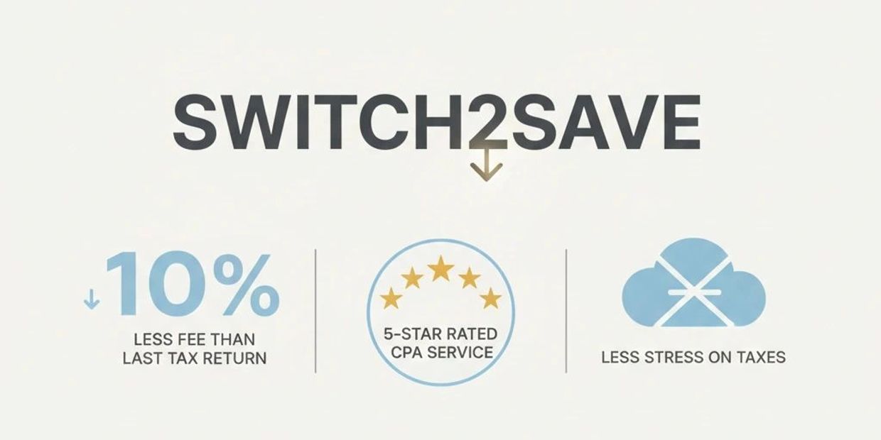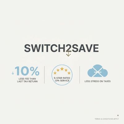 Switch over to us and get your tax return professionally prepared for 10% less than the fee you paid for your last filed tax return — minimum bill of $100.